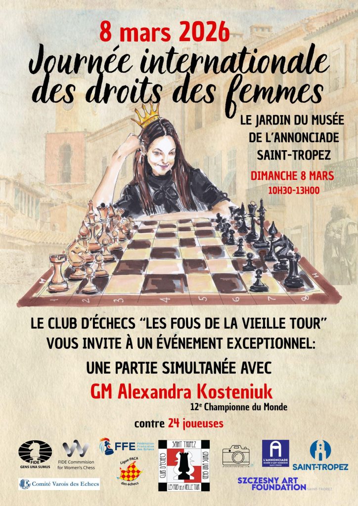 On March 8, 2026, the Saint-Tropez chess club “Les Fous de la Vieille Tour” will organize a special simultaneous exhibition with the 12th Women’s World Champion, GM Alexandra Kosteniuk. The event will take place from 10:30 AM to 12:30 PM, with free admission for the public. In case of unfavorable weather, the exhibition will be held at the Louis Blanc Hall in the center of Saint-Tropez.