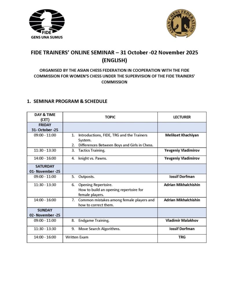 The Asian Chess Federation, in cooperation with the FIDE Commission for Women’s Chess (WOM) and under the supervision of the FIDE Trainers’ Commission (TRG), is pleased to announce the upcoming FIDE Trainers’ Online Seminar, taking place from 31 October to 2 November 2025.