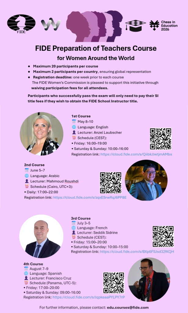 Throughout the month of March, events held across the world have brought together girls and women in chess, strengthening visibility, connection, and a sense of global community. Building on this momentum, the two commissions now join efforts to launch the FIDE Preparation of Teachers Course for Women Around the World – a joint initiative designed not only to support women in chess today, but to help shape the future of the game.